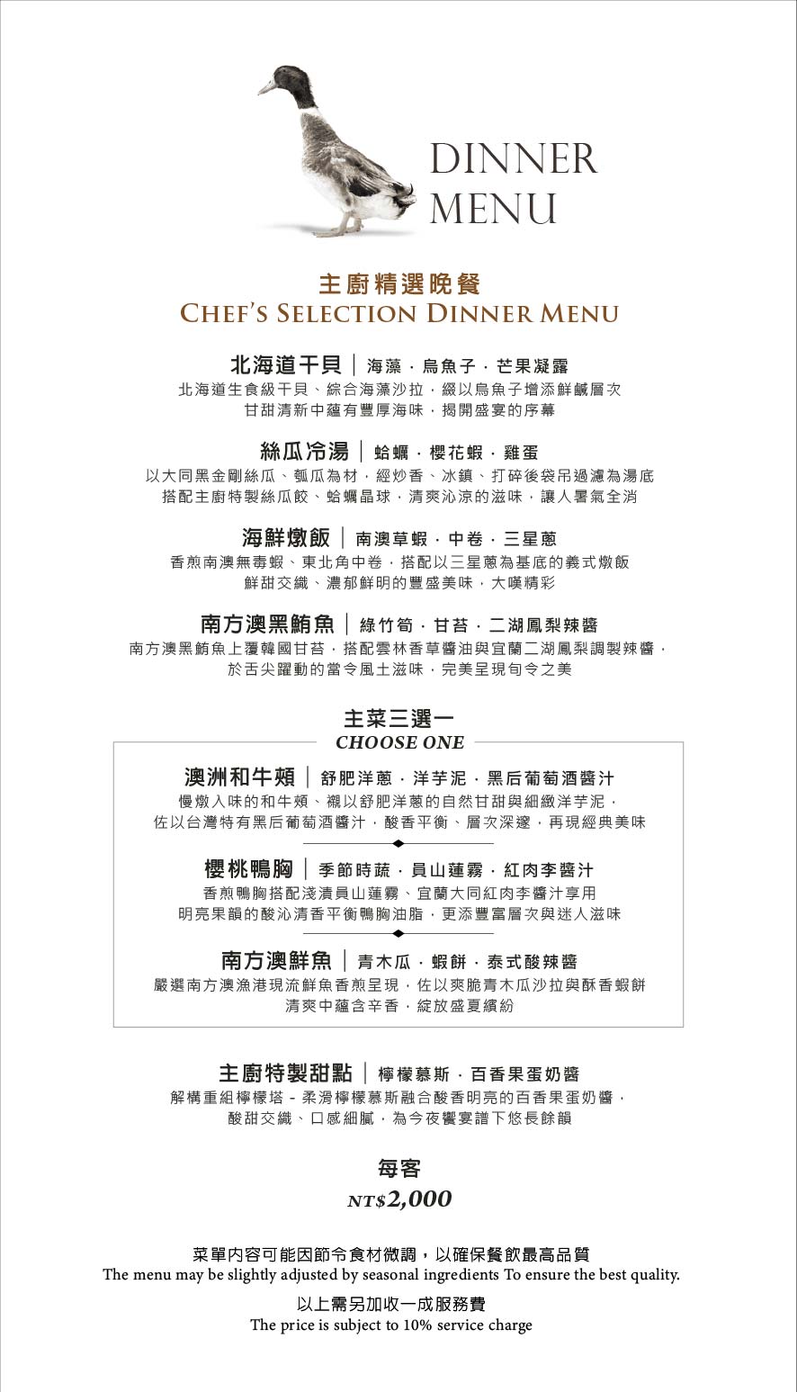 - Chef's Selection dinner is provided in the form of a set meal per guest.