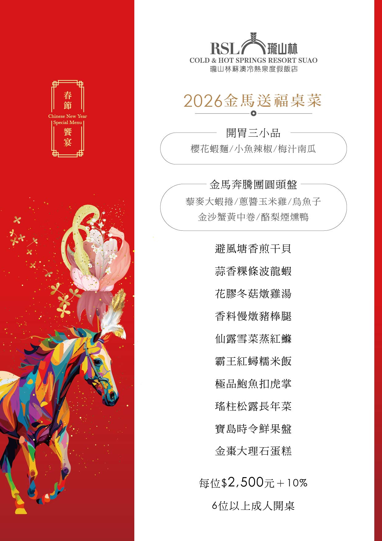 3. 春節桌菜6人以上成桌,未滿6人須補開桌差額,詳情洽飯店現場。